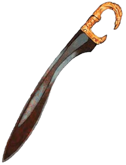 Esta pesada hoja tiene un único filo cóncavo y una empuñadura en forma de garfio. Su forma distribuye el peso para darle el impulso de un hacha con el filo cortante de una espada.
