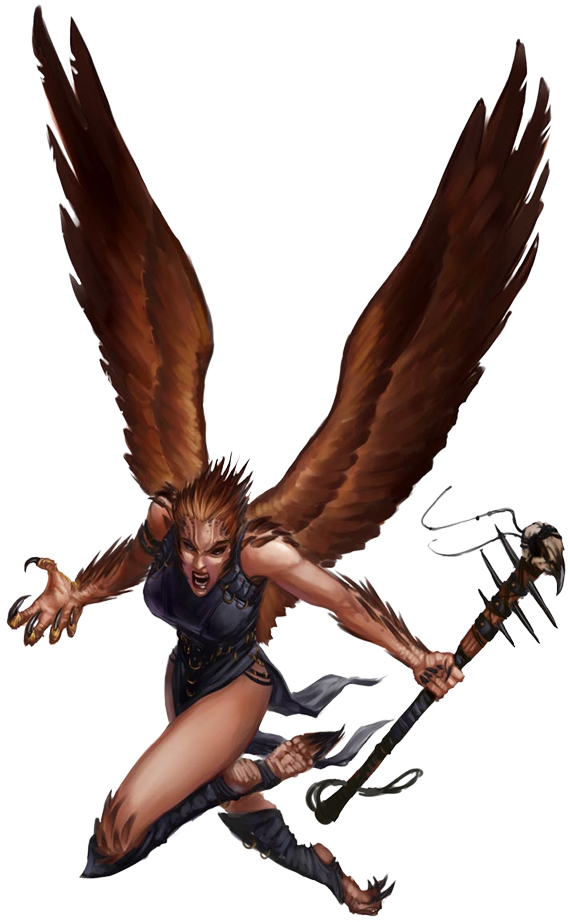 Vistas a menudo como despiadadas y corruptas, las arpías conocen los hábitos de las criaturas. Este conocimiento les otorga una ventaja cuando van en busca de su comida favorita. Aunque las criaturas salvajes caen fácilmente víctimas de sus canciones cautivadoras, estas viles mujeres-pájaro prefieren que su comida esté aderezada con complejos y confusos pensamientos. Las presas fáciles son una comida aburrida.