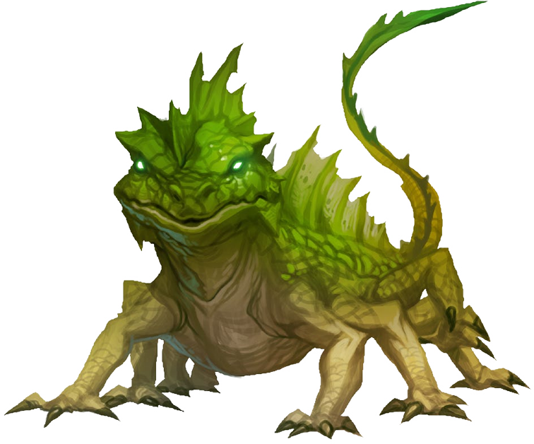 Este achaparrado monstruo reptiliano posee ocho patas, espinas óseas en el lomo dispuestas en fila, y unos ojos que brillan con un fuego verde pálido.