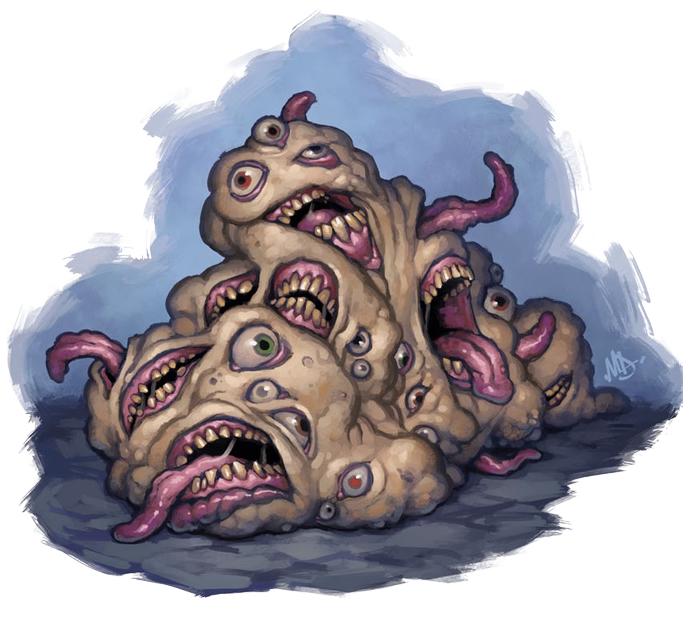 Esta horrible masa de ojos, bocas, y carne informe mira fijamente hacia todos lados, mientras sus incontables fauces chillan sin cesar.