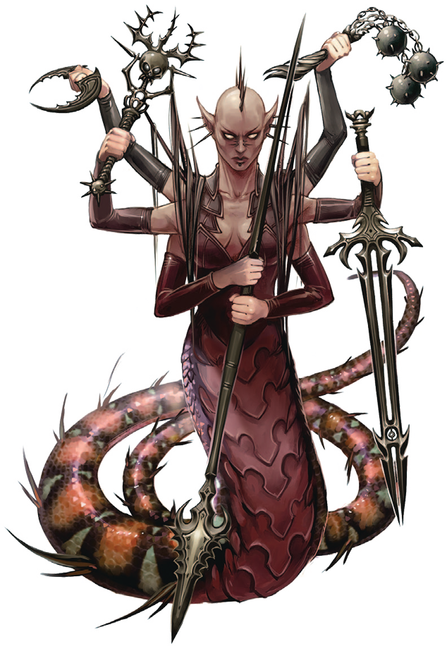 Este infernal con cuerpo de serpiente posee el torso de una mujer de seis brazos, orejas puntiagudas, y unos ojos brillantes y sobrenaturales.
