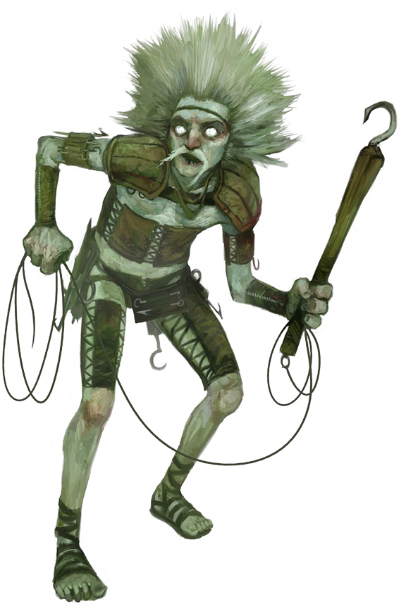 Este humanoide azul pálido posee ojos saltones y blancos, pelo alborotado, manos con cuatro dedos, y una gran clava con un garfio.
