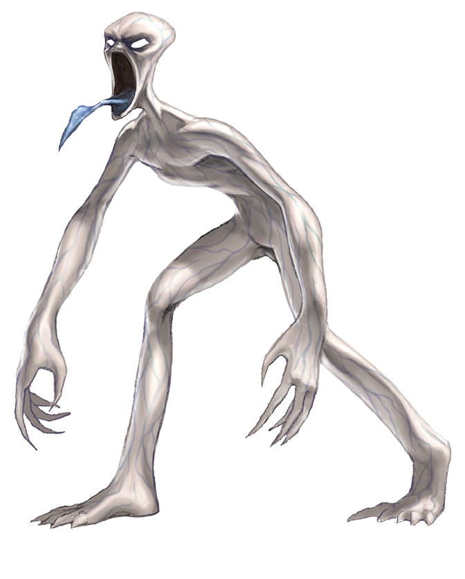 Esta grisácea criatura humanoide parece inacabada, con una cabeza estrecha, unas extremidades delgadas y una siniestra cara sin nariz.