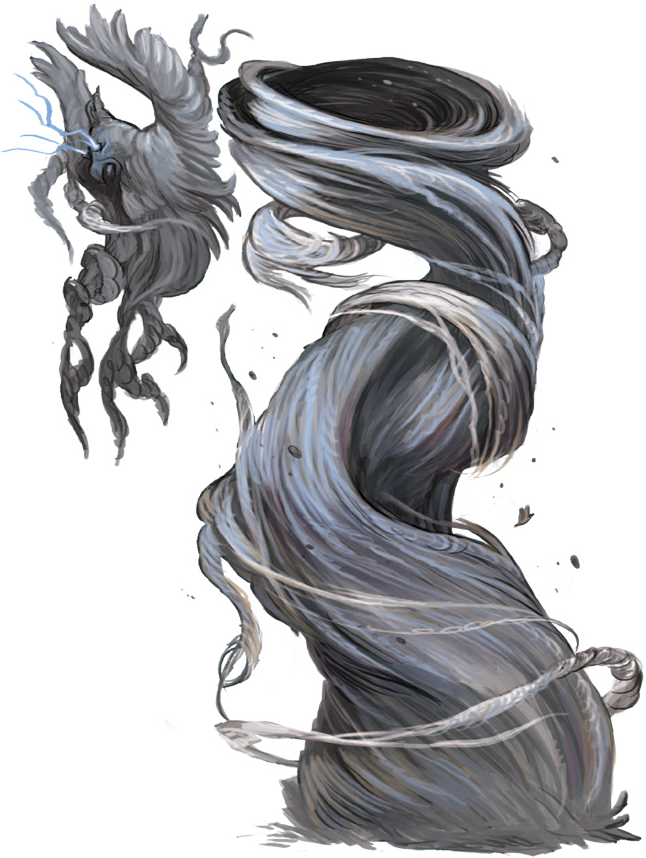 Los elementales de aire son criaturas voladoras y rápidas hechas de aire viviente. Primitivos y territoriales, se ofenden cuando se les convoca o cumplen órdenes de los mortales, y muchos prefieren pasar su tiempo en el plano del Aire, haciendo cabriolas y carreras por los cielos infinitos.
