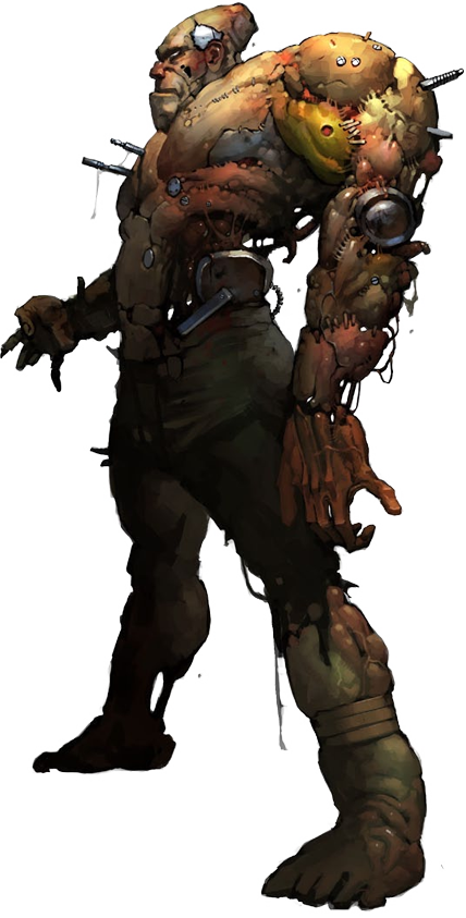 Una horrible monstruosidad, construida a base de fragmentos de cuerpos cosidos unos a otros con cuerda gruesa, cables y grapas de metal, se mueve torpemente en un horrible simulacro de vida.
