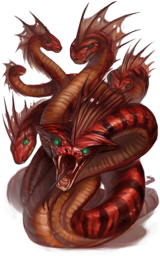 Varias cabezas serpentinas y enfurecidas se alzan a partir del cuerpo liso y también serpentino de este aterrador monstruo.