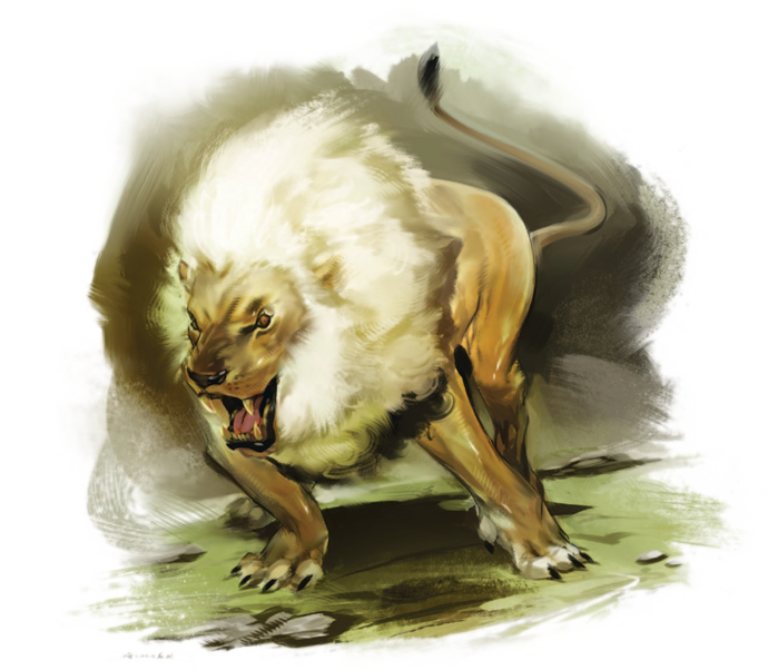 Los leones macho miden de 5 a 8 pies (1,5-2,4 m) de longitud y pesan de 330 a 550 libras (149-248 kg). Los leones suelen ser el depredador animal dominante de su territorio, aunque recurren a la carroña de ser necesario o conveniente. Pueden matar a otros depredadores (como leopardos y hienas) que invaden sus territorios habituales, pero es raro que se los coman a menos que la caza escasee. La mayoría no caza humanoides de forma selectiva, pero ocasionalmente uno aprende lo fácil que es matarlos y se convierte en un devorador de hombres.