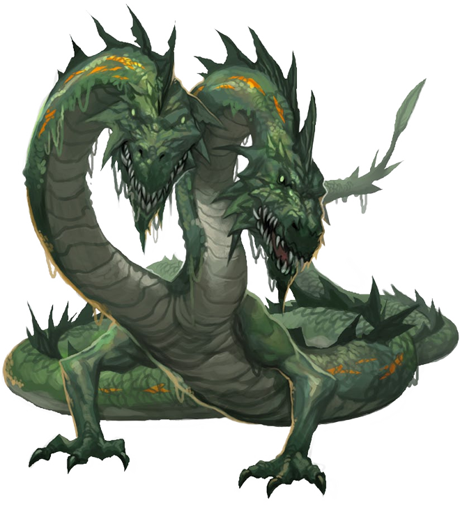 Este dragón, espeluznantemente grande y parecido a una serpiente, posee dos cabezas igualmente aterradoras, cuyas mandíbulas hierven de ácido y veneno.