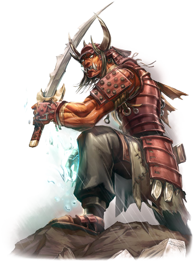 Enfundado en una bella armadura, este gigante de atavíos exóticos ruge mostrando unos colmillos relucientes, y unos ojos llameantes de intenciones asesinas.