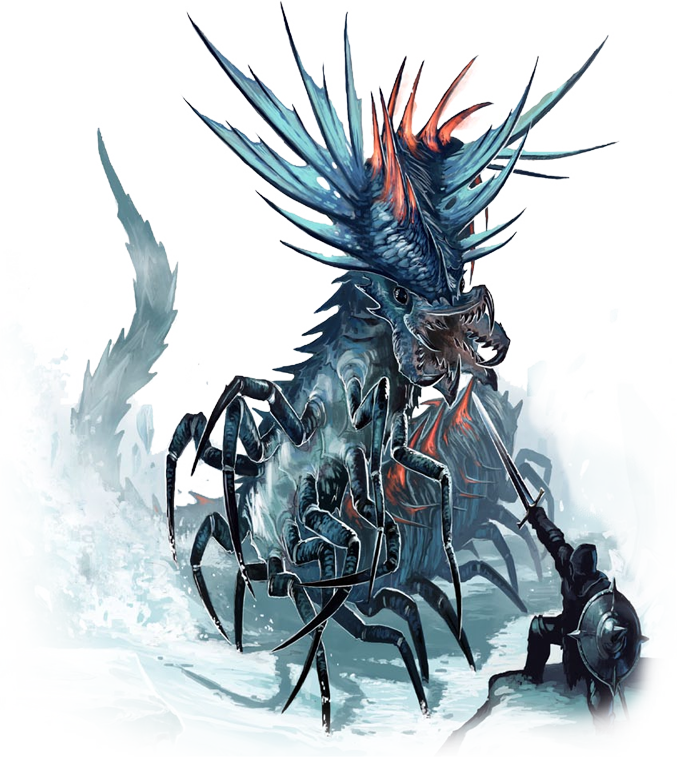 Una inmensa bestia similar a un ciempiés surge de repente de la nieve, mostrando filas de placas quitinosas e incandescentes en el lomo.