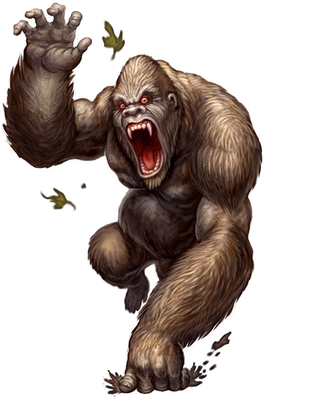 Un simio macho adulto mide 8 pies (2,40 m) de altura y puede pesar hasta 400 libras (180 kg). Aunque generalmente son criaturas tímidas y pacíficas cuando no se les molesta, los gorilas son territoriales y se vuelven muy agresivos cuando se les provoca. Este bloque de estadísticas suele usarse para cualquiera de los tipos más grandes de primates, como los gorilas (para simios más pequeños como orangutanes y chimpancés, aplica la plantilla joven). Los primates más pequeños deberían usar las estadísticas de los monos.