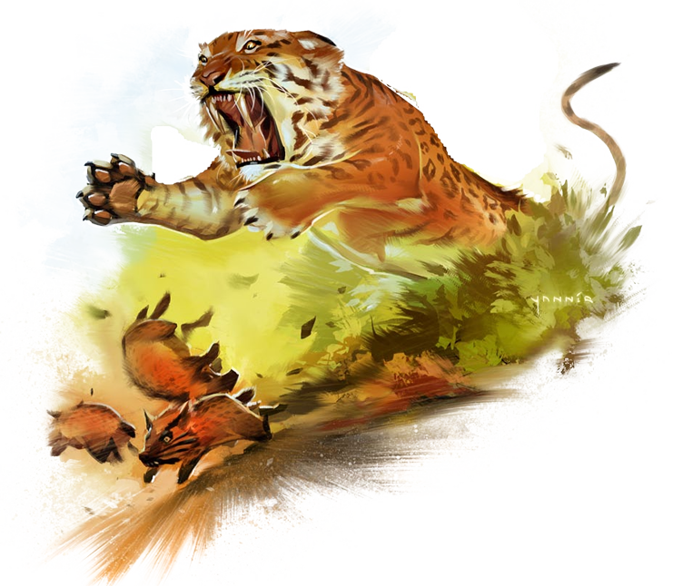 Este gran tigre gruñe como advertencia cuando se agazapa, con dos colmillos como sables sobresaliendo hacia debajo de sus poderosas mandíbulas.