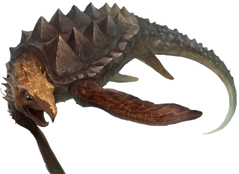 Esta bestia acuática de larga cola parece una gigantesca tortuga caimán, con rasgos dracónicos.
