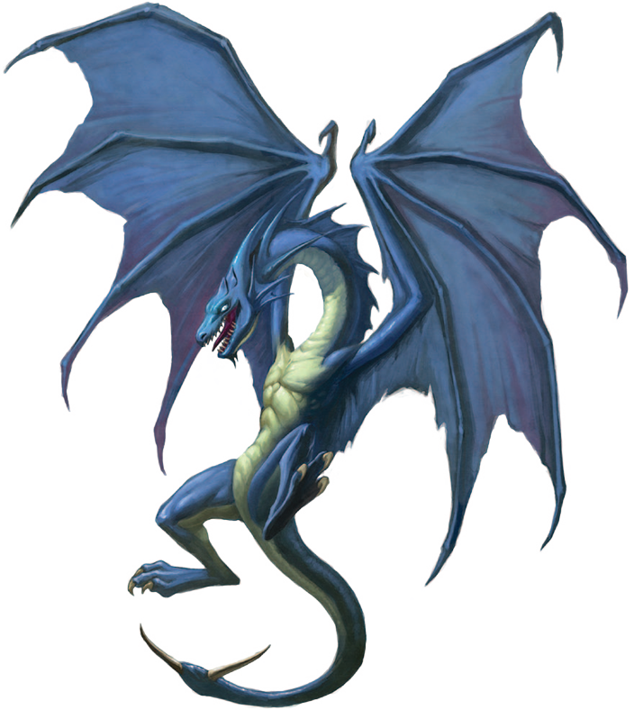 Un dragón azul oscuro, de inmensas alas y una cola con una púa en forma de garfio en su extremo, aterriza sobre dos pies con forma de garra, rugiendo a modo de desafío.