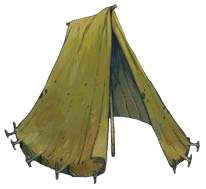 Las tiendas de campaña existen en una gran variedad de tamaños y acomodan a entre 1 y 10 personas. Una tienda pequeña da abrigo a una criatura Mediana y cuesta 20 minutos montarla, en una tienda mediana caben dos criaturas y se monta en 30 minutos, una grande aloja a cuatro criaturas y se monta en 45 minutos, y un pabellón tiene espacio para diez criaturas y cuesta 90 minutos de montar (dos criaturas Pequeñas cuentan como una criatura Mediana y una criatura Grande cuenta como dos Medianas). Las tiendas pabellón son lo bastante grandes como para que quepa una pequeña fogata en el centro. Recoger una tienda cuesta la mitad de tiempo que montarla.